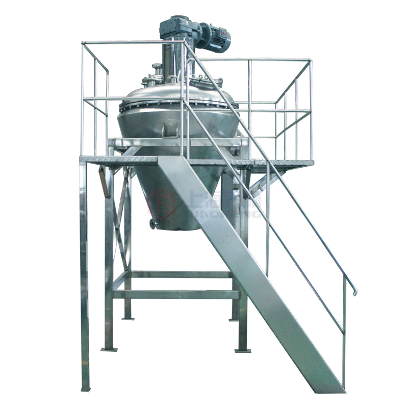 本機由加熱錐體設有加熱夾套,熱源為熱水、導熱油或低壓蒸汽,從而使錐體內壁保持一定的的溫度。變頻調速電機經平行斜齒輪減速機,驅動單螺帶攪拌器旋轉,帶動物料沿錐型筒旋轉并自下而上提升,物料到達頂后由重力和慣性作用,自動流向旋渦中心回到錐型筒體底部,整個過程使物料在錐型筒體內強制加熱,相對對流、摻混,熱量在物料中相互擴散,使物料作不規則往復運動,完成物料在筒壁表面進行高頻率傳熱交換,在短時間內達到加熱干燥的效果。從而使物料內部水份不斷蒸發,在真空泵的作用下,水蒸汽由真空泵引出,如須回收液體可加冷凝器、回收液儲罐回收。干燥完成后,打開下部的出料閥出料。