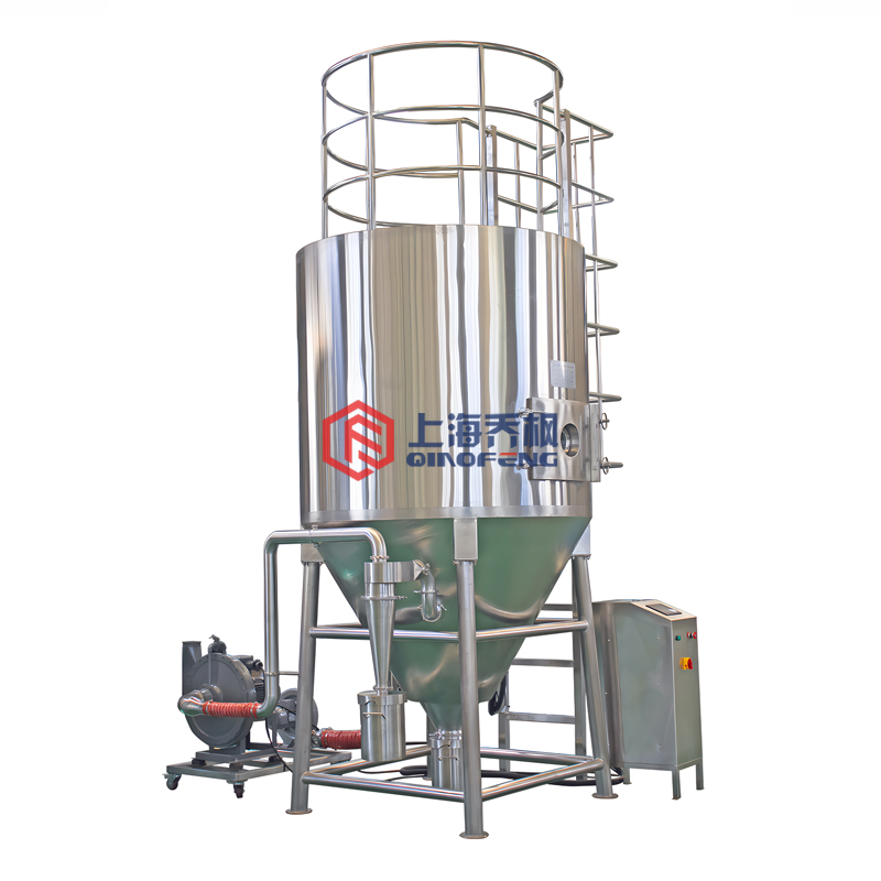 空氣經過濾和加熱,進入干燥器頂部空氣分配器,熱空氣呈螺旋狀均勻地進入干燥室。料液經塔體頂部的高速離心霧化器,(旋轉)噴霧成極細微的霧狀液珠,與熱空氣并流接觸在極短的時間內可干燥為成品。成品連續地由干燥塔底部和旋風分離器中輸出,廢氣由引風機排空 。